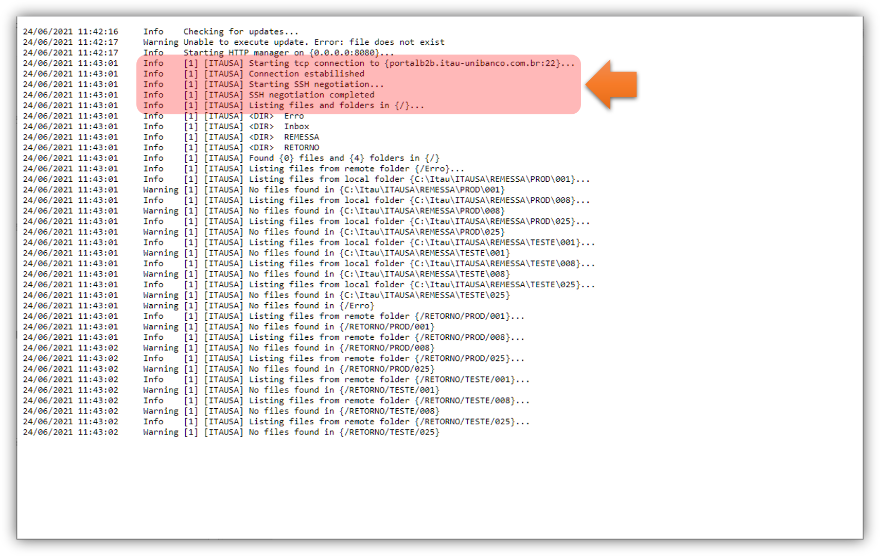Observação: na imagem está destacado trecho que indica sucesso na conexão com o Itaú.